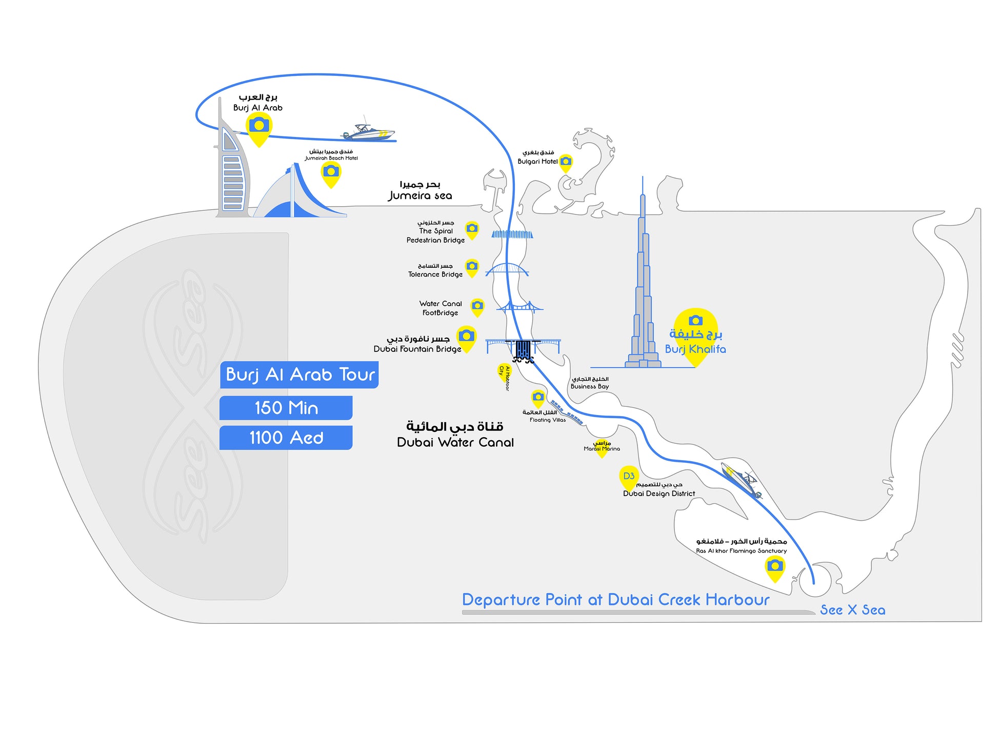 Embark on the 150-minute Golden Pathway Tour and discover Dubai's hidden gems and iconic landmarks. See Al Khor Flamingo Sanctuary, Dubai Design District, Marasi Marina, Burj Khalifa, Al Habtoor City, Tolerance Bridge, The Spiral Pedestrian Bridge, Bulgari Hotel, Jumeirah Beach, and Burj Al Arab. Book now for a once-in-a-lifetime adventure and capture unforgettable memories.
