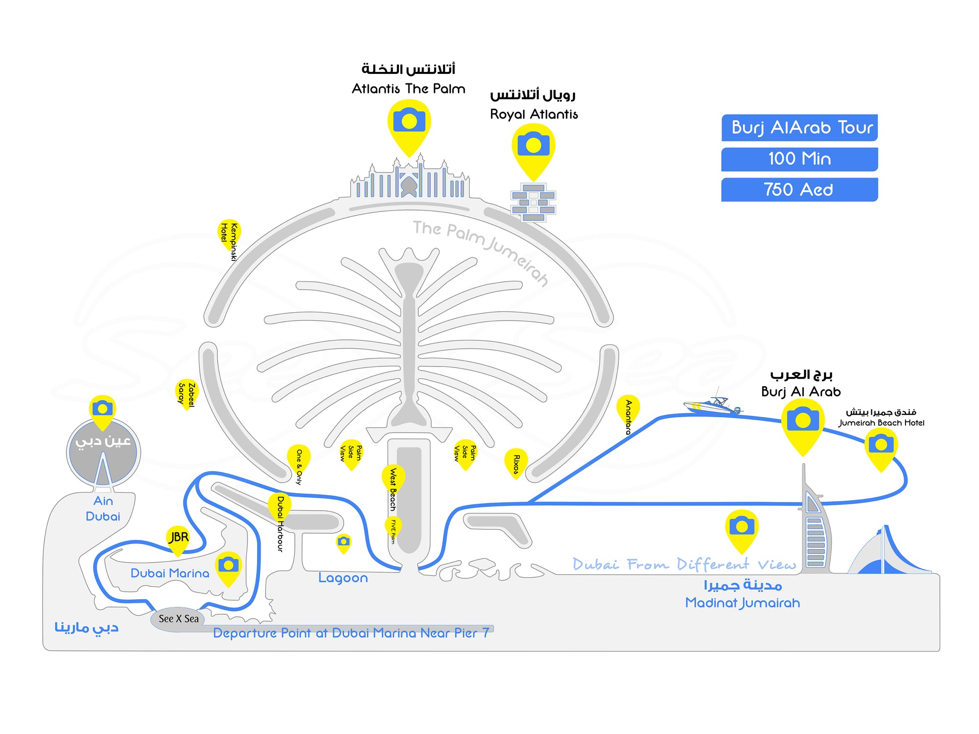 We're excited to offer you two incredible tour options to choose from: The Palm Jumeirah Discovery Tour and the Skyline Romance Tour. Both tours are 100-minutes long and will take you to see Jumeirah Beach Residence, Ain Dubai, and the Lagoon. The Palm Jumeirah Discovery Tour will also take you to Atlantis the Palm and the Royal Atlantis, while the Skyline Romance Tour will take you to Dubai Harbor and the iconic Burj Al Arab.